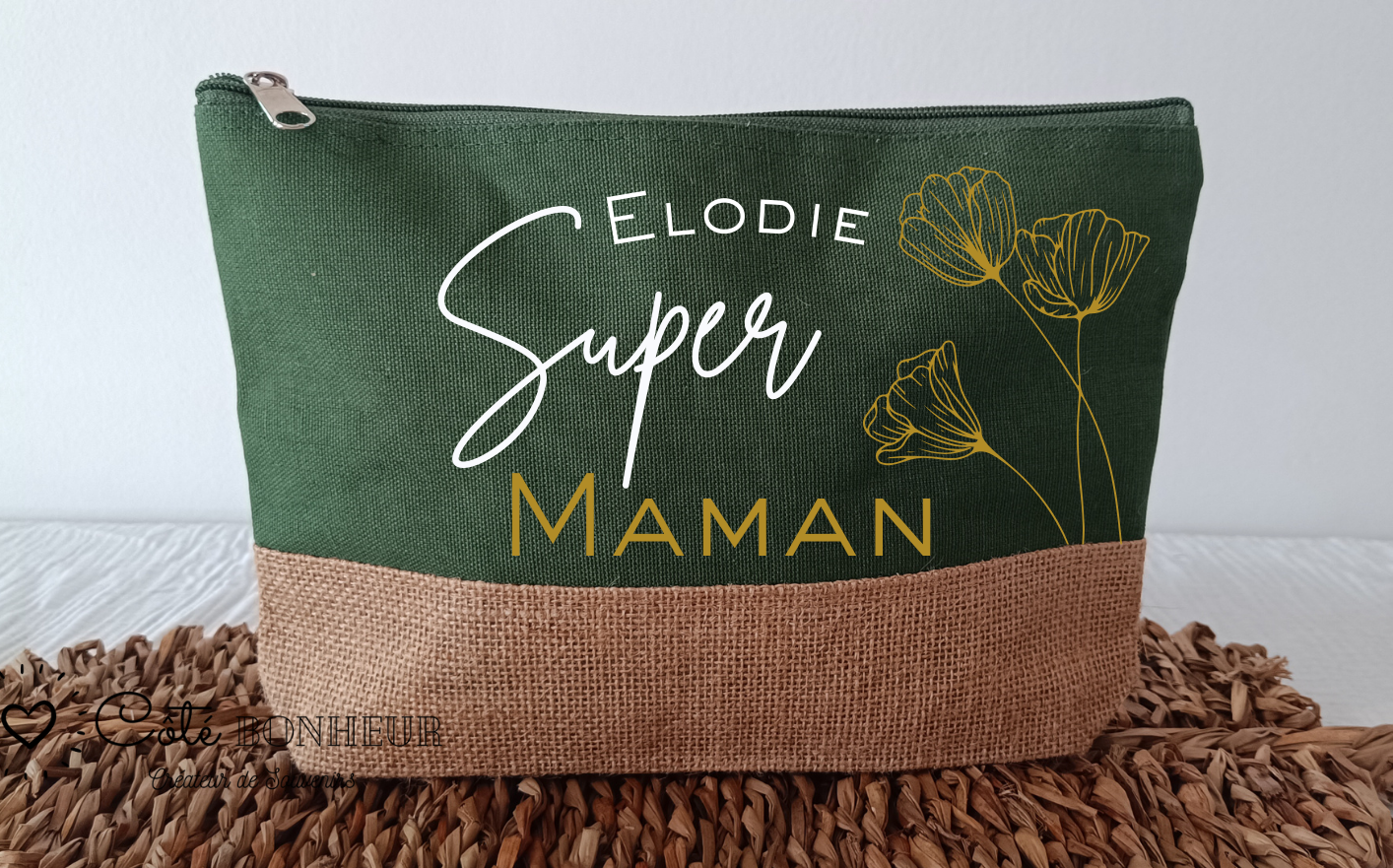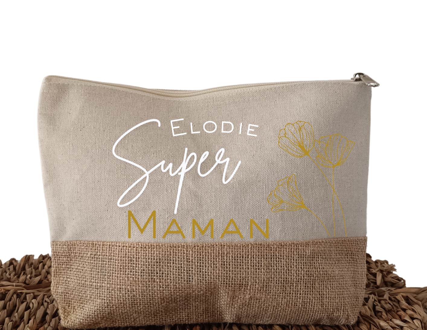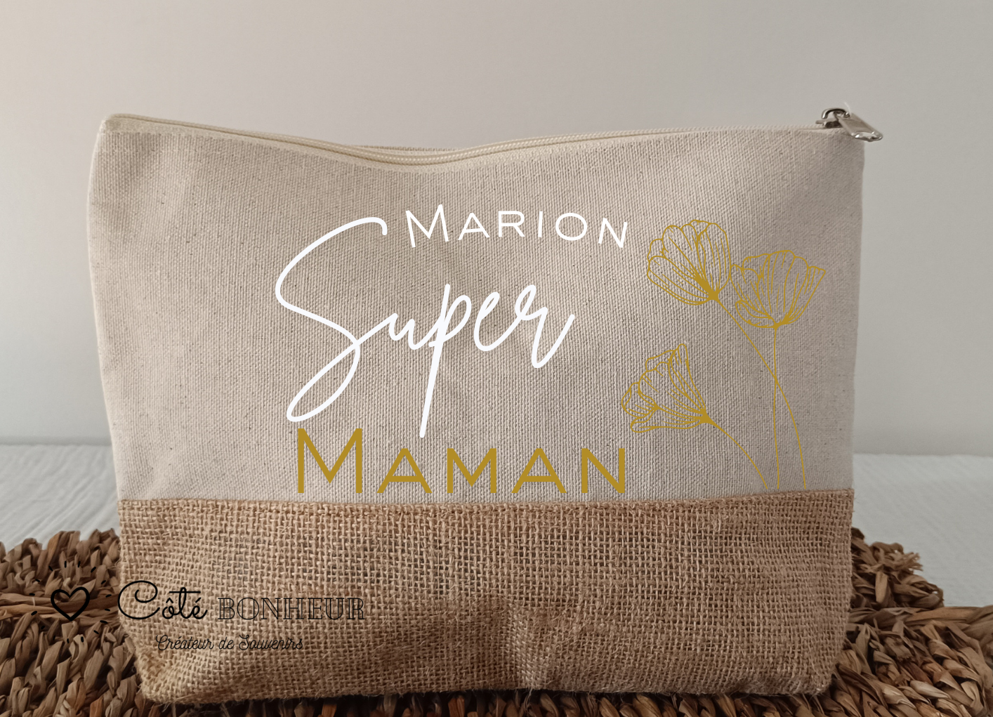 Trousse personnalisée Super Maman avec prénom – Cadeau fête des mères – Pochette coton et jute – Cadeau maman origina