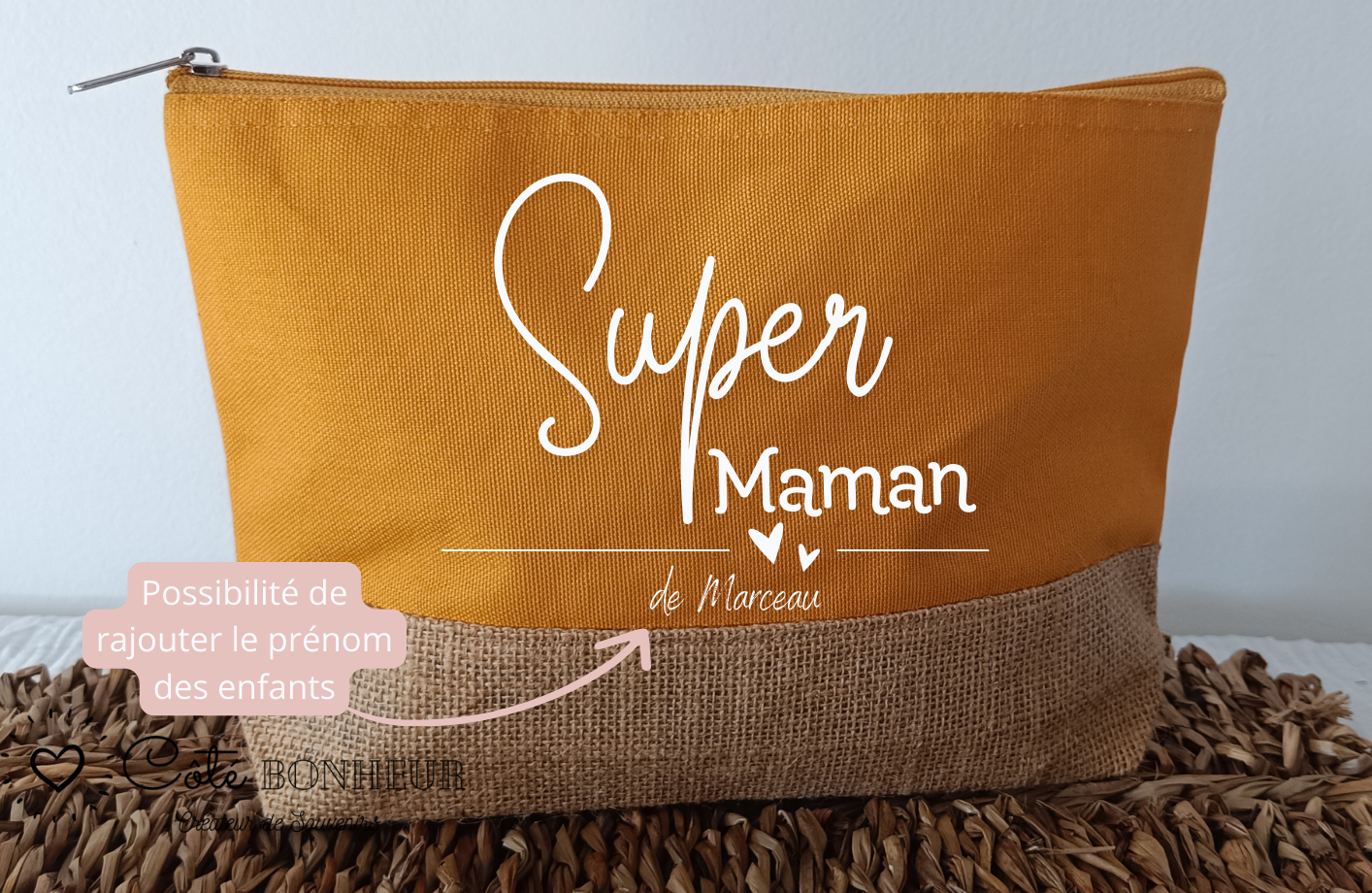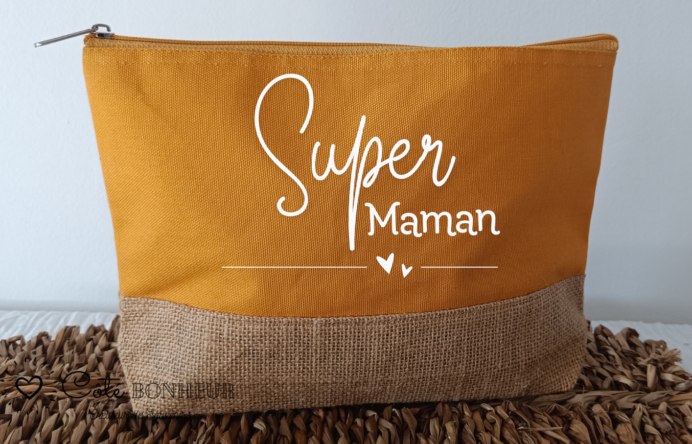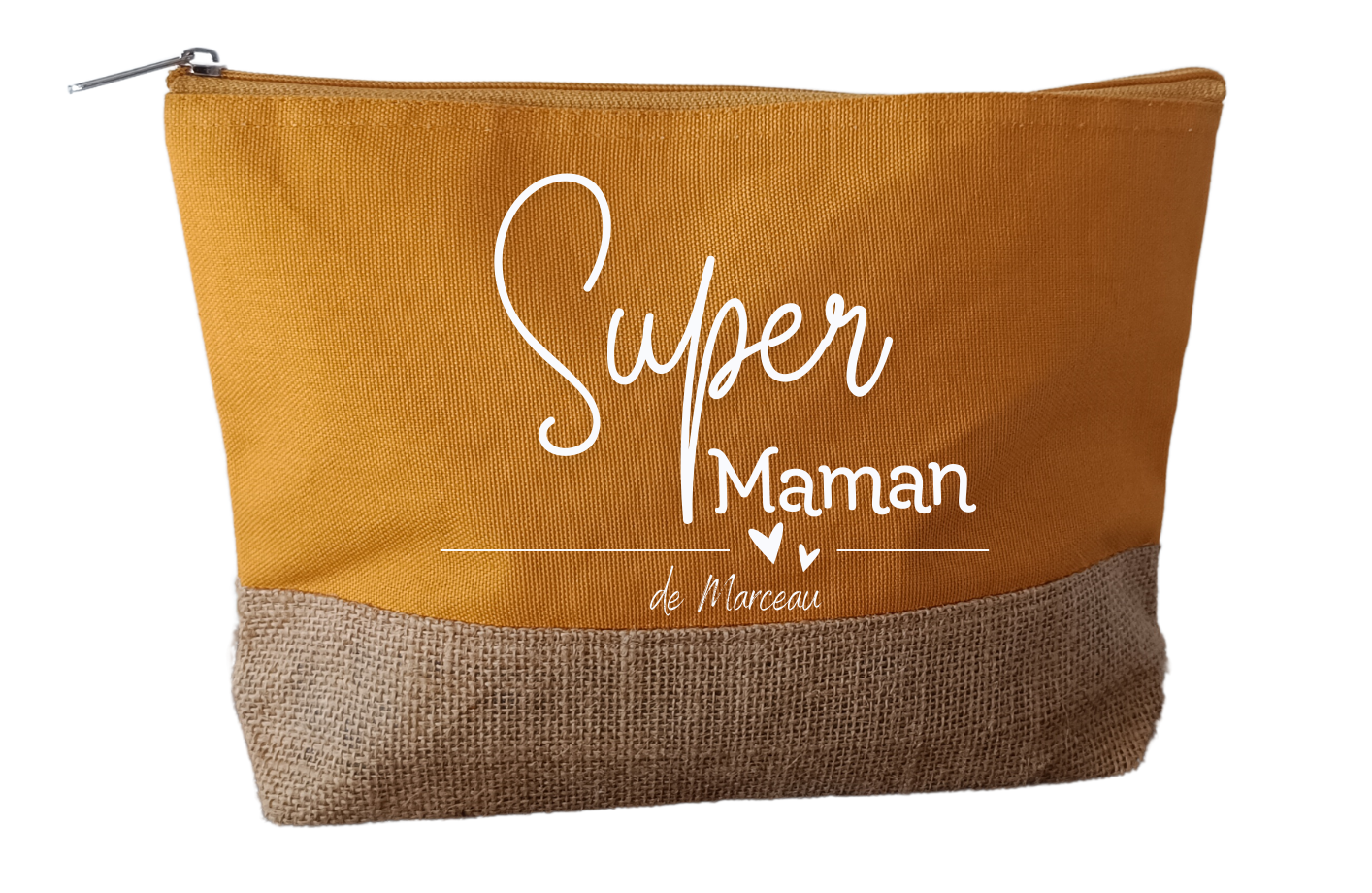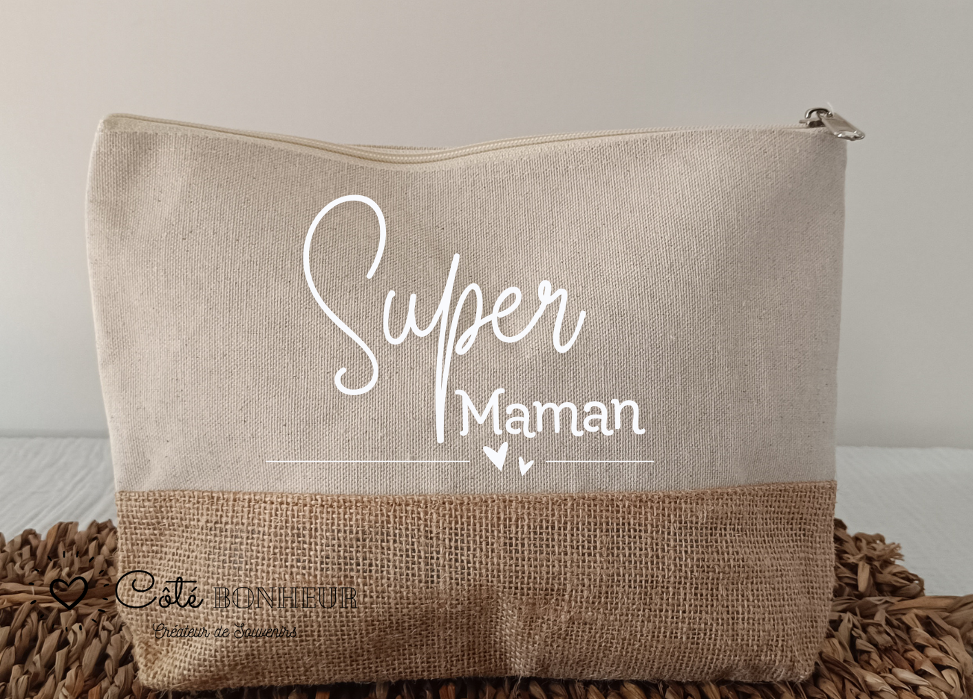 Offrez (ou offrez-vous !) une jolie trousse de beauté personnalisable, pensée pour les super mamans du quotidien ! Pratique, élégante et pleine de tendresse, cette trousse en toile résistante et fond en toile de jute naturelle est idéale pour ranger maquillage, accessoires, papiers ou petits trésors.